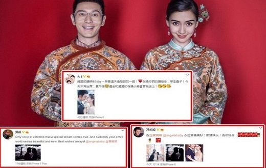 至於与Angelababy分属同门的熊黛林留言:「祝你们新婚快乐,甜甜蜜蜜,永远保持初恋的感觉。」而杨冪就以「王子」同「公主」称呼晓明同Baby,留言:「今天是幸福的大日子,王子你要永远呵护好我们的公主啊,要幸福。」歌手任贤齐就祝福二人:「在这花好月圆的日子!祝福晓明、Baby百年好合!幸福一生!」
