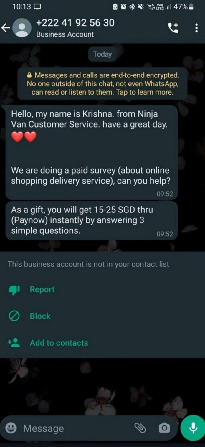 物流公司能者快递(Ninja Van)周一(6月19日)发文告说,公司接获不少公众通报收到冒充公司员工以WhatsApp发出的短讯。在短讯中,冒充者要求公众完成一项问卷调查,以换取15新元到25新元不等的现金奖励。