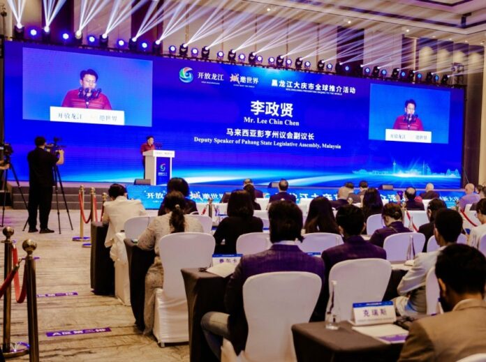 (黑龙江23日讯)彭亨州副议长李政贤日前于中国黑龙江省大庆市推介礼上,向中外16个国家和国际组织外交使节及代表、记者、企业代表共200馀人推介彭亨州旅游与经济合作。