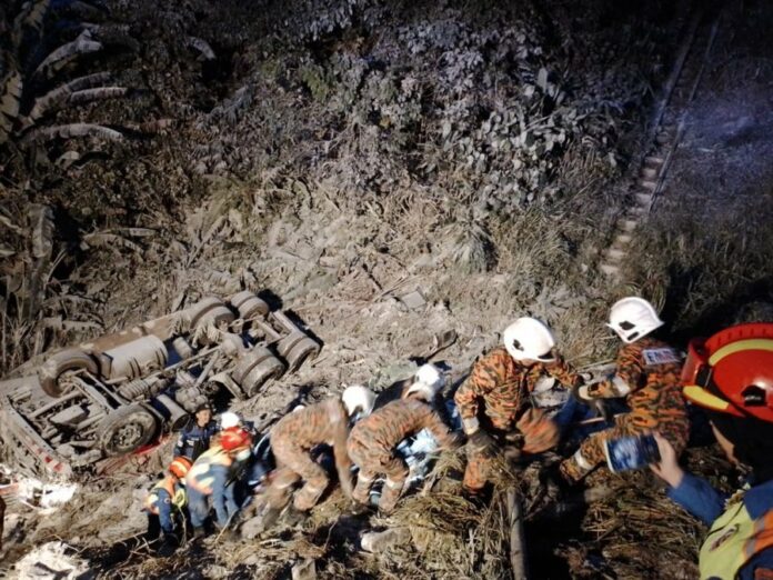 (文冬27日讯)加叻大道武吉丁宜路段周二凌晨发生车祸,一辆载满沙石的拖格罗里在第43公里路段坠入10公尺深峡谷,司机夹毙身亡!