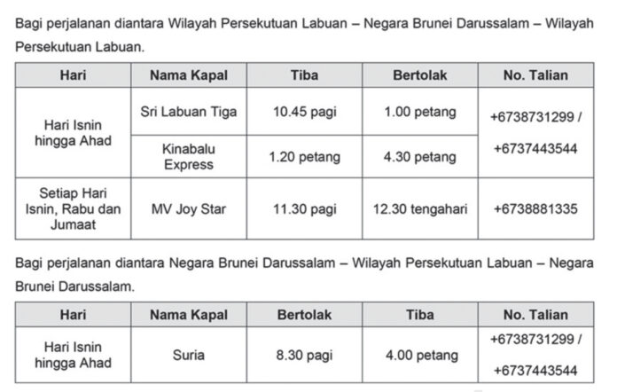 每周一至周日的行程:SRI LABUAN TIGA每天下午1时从汶莱出发;KINABALU EXPRESS每天下午4时30分从汶莱出发;以及MV JOY STAR 每周一、周三及周五中午12时30分从汶莱出发。
