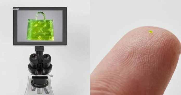 从MSCHF公开的照片中可以看到,这款印有LV经典老花图腾Monogram的“微米手提包”的体积只有657x222x700微米(1微米=0.0001公分),比盐粒还要小。