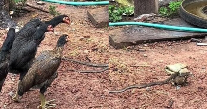 至于后续发展,慢半拍的蟾蜍后知后觉逃走了,剩下陷入尴尬的三索锦蛇无奈转头离去,没想到身后居然站着4只宛如在看笑话的公鸡,目送它离开。而这4只公鸡,刚刚也全程目睹三索锦蛇猎捕蟾蜍,不过它们似乎不知道,自己也可能成为三索锦蛇的盘中餐,还傻傻的站在一旁围观。