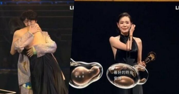 在安溥上台领奖之前,好友青峰特地上前拥抱她,这一刻安溥忍不住落泪,而台下的好友也情不自禁地哭得流鼻涕。