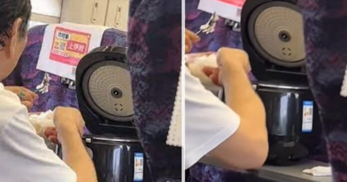 从影片可见,大妈从包包内掏出免洗碗筷,用铁汤匙盛饭给一旁大爷,小桌板上确实有一个电饭锅,旁边还有配菜,大妈的举动也吸引后座的年长乘客张望。