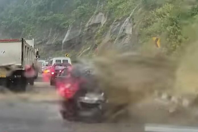 早前,社交媒体流传一个时长21秒的视频,在一处靠山坡道路发生巨石滑落,导致数辆轿车被压毁的事件。