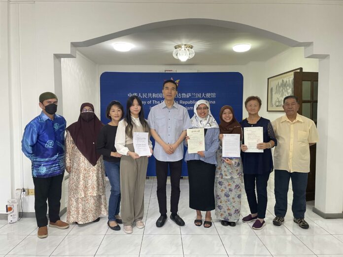 (汶莱斯市13日讯)中国驻汶莱大使肖建国向汶莱留学生颁发中国大学录取通知书。