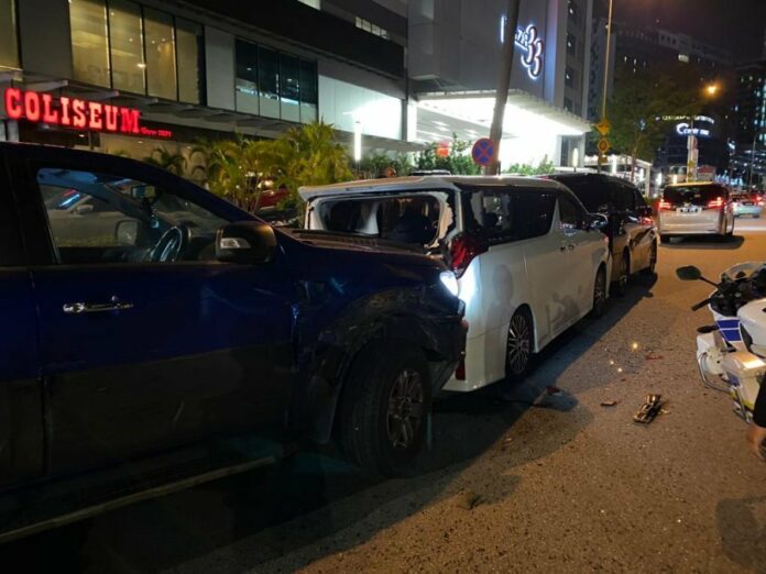 “该皮卡司机在逃逸过程中违例驾驶,在灵市13区连续碰撞停放在Plaza33大厦路旁的3辆轿车,还导致一路人双脚受伤!”