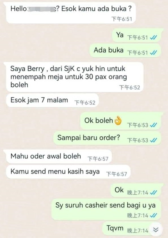 该校董事长张学聪律师今日向警方报案,并否认该校近日曾有向任何一家餐厅或酒楼订餐或订桌,而且该校校方也声明近日内并没有举办任何晚宴或聚餐活动,所以强调此举并非出至于该校,而是有人冒用该校名义来干案。