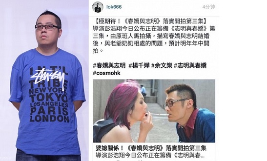 (香港13日讯)余文乐在微博分享了一则彭浩翔將筹拍《春娇与志明3》的新闻,报导指电影有望明年5、6月开拍,除了原班人马外,会加入志明父母的角色,主要讲春娇志明婚后,两代人的沟通问题。