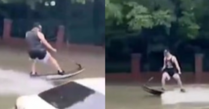 中国江苏无锡近日下暴雨,导致道路严重积水,一名男子上班途中车子堵在积水前方,又不想绕路,因赶时间竟然踩著动力冲浪板去上班。