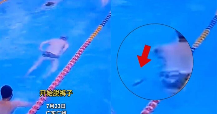 视频显示,一男子在泳池里游泳,边游泳边用双手脱掉泳裤,然后边划手蹬腿游泳边排便。拉完后,男子又把泳裤穿好继续游泳。