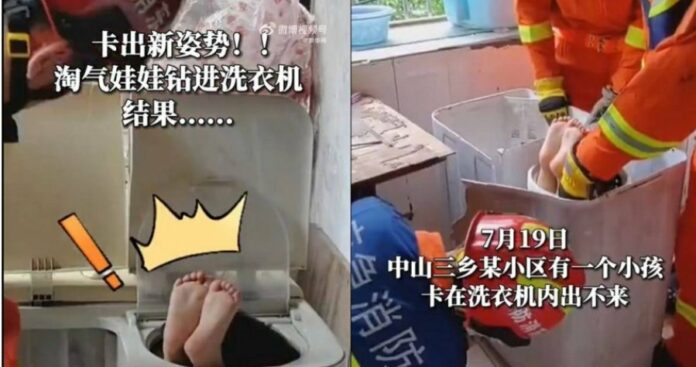 中国广东一名男童被发现卡在洗衣机里,只有一双脚露在洗衣机外,所幸经过消防员30分钟救援后成功救出,初步观察男童并未受伤。