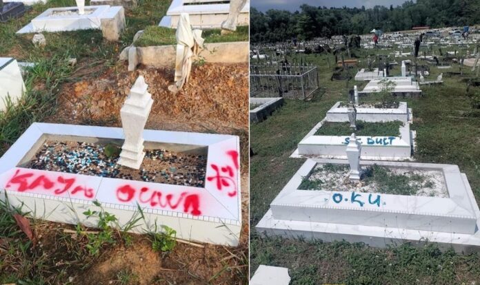 砂拉越民都魯 被人喷上红蓝色油漆 砂逾50穆斯林坟墓遭破坏 2023年7月24日 (民都鲁24日讯)墓园遭到破坏,51个坟墓成为墓地破坏者的目标。Advertisement 据悉,今早7时左右,位于甘榜甘文丁穆斯林墓园被发现遭人蓄意破坏。 一共有51座坟墓上被人喷上红色和蓝色的油漆,此举对亡者不敬。