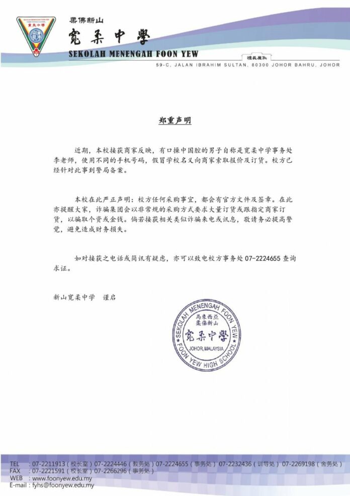 宽柔中学今日发出官方声明表示,近期接获商家反映,有口操中国腔的男子自称是宽柔中学事务处的“李老师”,并使用不同的手机号,假冒学校名义向商家索取报价及订货。