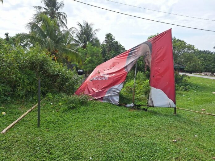 (万挠26日讯)首相拿督斯里安华在万挠印有首相肖像的宣传看板遭人破坏,人民公正党副宣传主任兼万挠原任州议员蔡伟杰强烈谴责反对者的犯罪行为!