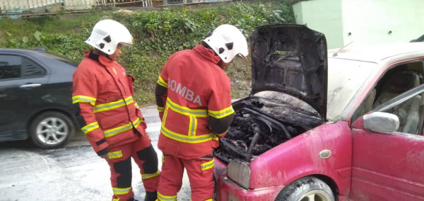 亚庇27日讯|一辆行驶中的国产灵鹿不知何故突然冒烟起火,车头引擎全被烧燬。