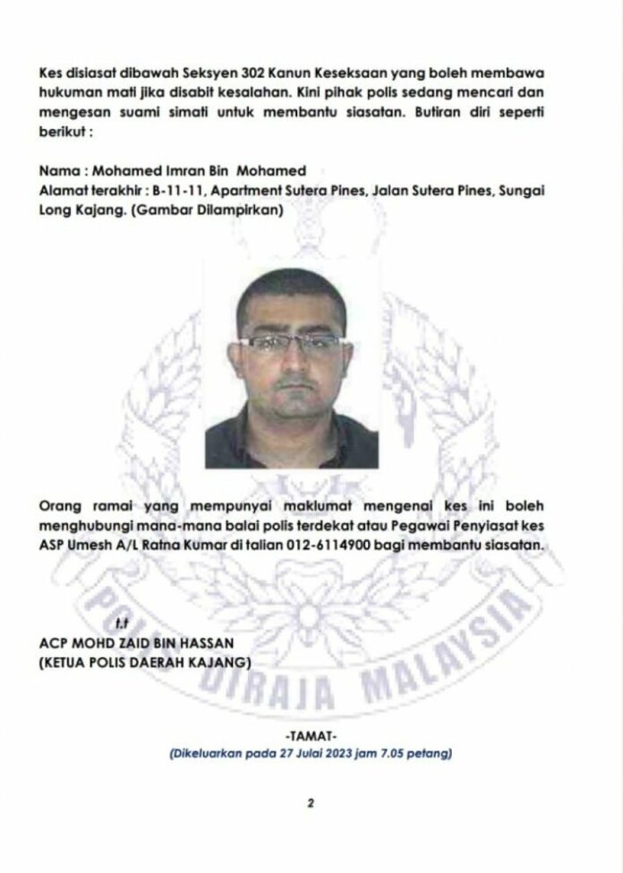 他指出,警方目前正在积极追踪死者32岁的丈夫莫哈末依姆兰,他最后出现的地址是加影Sutera Pines Apartment, Jalan Sutera Pines, Sungai Long, Kajang。