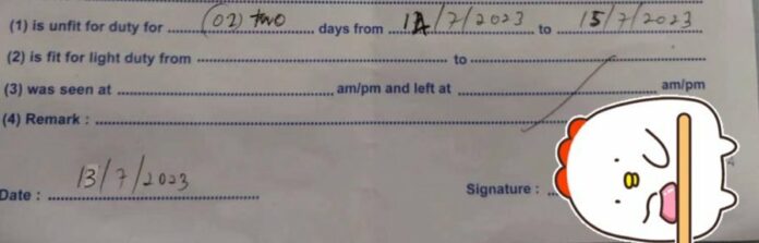 雇主透过面子书专页“Ricebowl铁饭网”匿名投稿,表示这名女子处于试用期,显示病假单是两天,不过很明显有被改过的痕迹。
