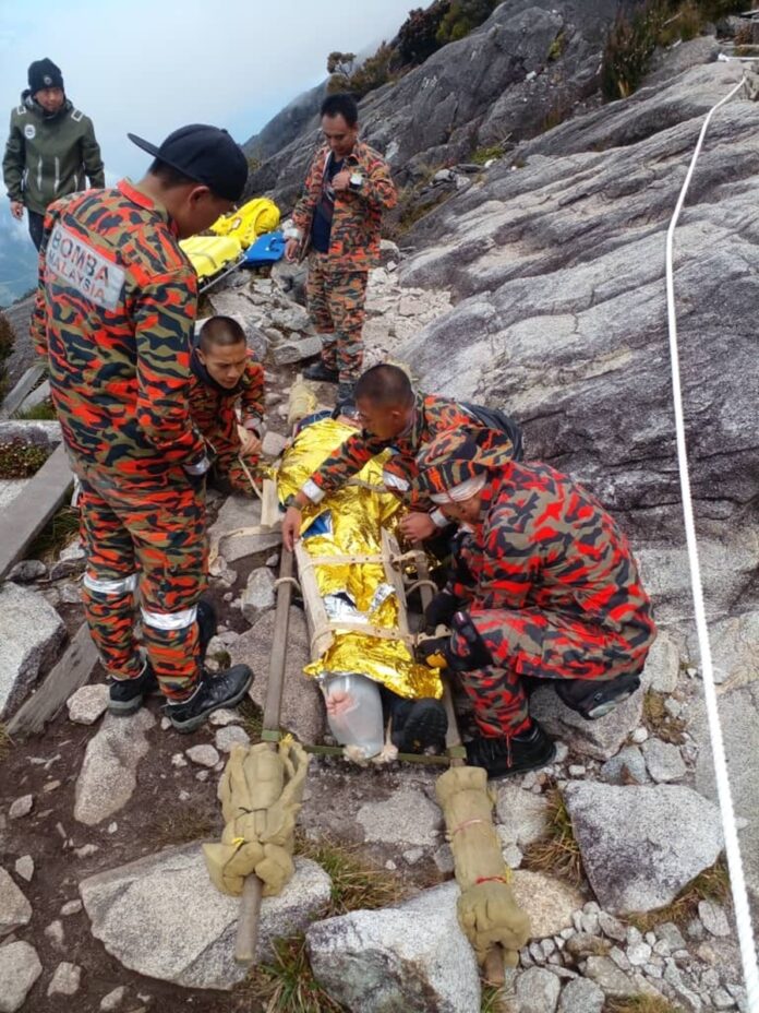搜救员抵达现场后立刻为这名44岁的本国华裔男子包扎脚踝肿痛伤口,并盖上锡箔被单避免体温流失,再使用帆布担架将她一路抬到山脚下的丁伯汉登山口。