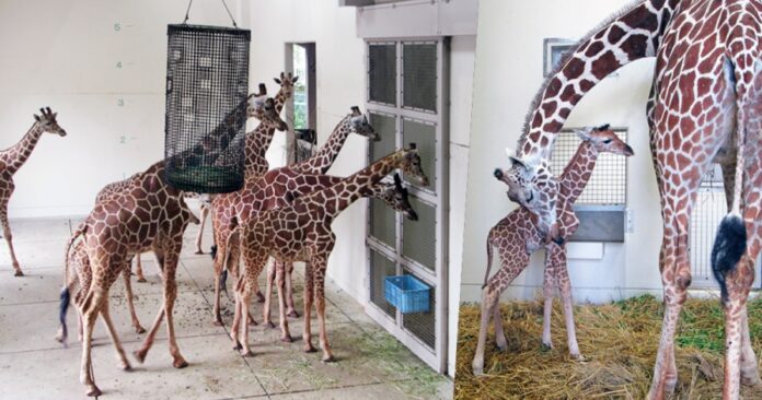 日本一家动物园最近迎来了一只母长颈鹿的顺利分娩,她成功生下了一只小长颈鹿幼崽。当其他长颈鹿得知这一好消息后,竟然纷纷安静地聚集在产房外围观,让饲养员直呼太可爱了。