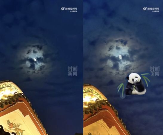 当晚,有网友在世大运开幕式上看到了这幅「熊猫云」景象,并将视频上传到社交平台。从影片中可以看到,在月光的映衬下,夜空中的薄云层形成了一只大熊猫的形象,它似乎怀中还抱着明亮的月亮。