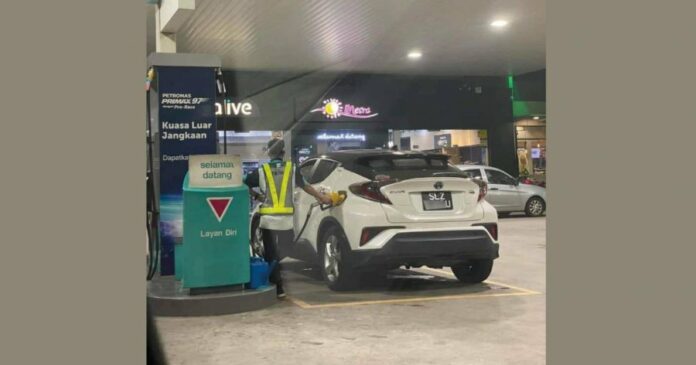 面子书专页“Kayangan Holding”周三(2日)上传一张照片,可见一名穿著国油(Petronas)油站制服的男子,正在为一辆新加坡注册车牌休旅车添油。