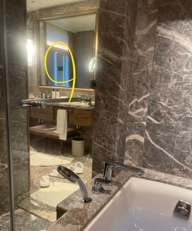 她退房前进浴室洗澡,洗到一半却察觉有人,一抬头就从镜子里看见一名男性员工打开房门,对方见状似乎喊了“我等等再过来”或是“我马上出去”就离开,但她在全身赤裸的状况下,吓得连声音都叫不出来。