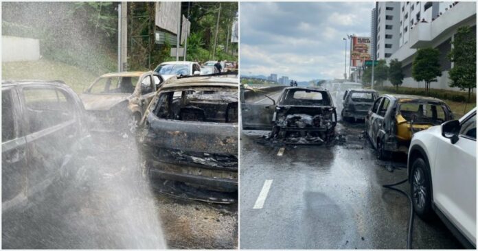 (吉隆坡6日讯)两名男子试驾的一辆车不明原因起火,幸运地他们及时逃出车外,避免了悲剧,但火势却波及了路边停放的四辆轿车,导致这些车辆受损程度不同。