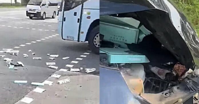 从视频可见,肇事的轿车是一辆马国注册车辆,车头被撞到凹陷,保险杠脱落,引擎盖也翘起,里头竟藏著多盒香烟,相信散落一地的香烟源自该轿车。