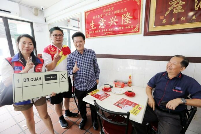 柯鹏飞今上午在面子书专页上载于一种竞选团队成员,穿著短裤在选区拜票的照片。