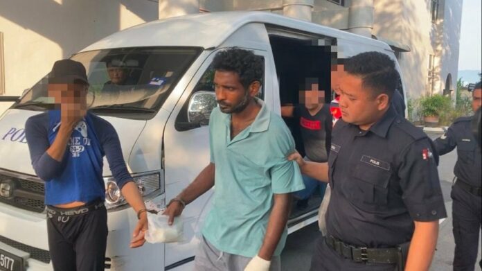 被告勒迪纳沙米被警方于周三早上押解至北海法庭,他的左手被包扎着,据信受伤,右手被戴上了手铐。
