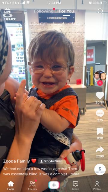 根据fox5报道,西奥的父亲杰里米(Jeremy)拍下了儿子戴上新眼镜的甜蜜时刻。在视频中,戴上眼镜后,西奥环顾四周,露出了灿烂的笑容。这家人在TikTok上写道:“我们很高兴我们的小家伙在未来的日子里都能美美地戴着眼镜!”