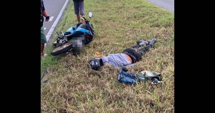 事发当时,摩托车骑士时乘骑摩托车取道上述路段往古晋方向上班,不料在来到上述路段时发生碰撞意外。骑士连人带摩托车飞跌路中央的安全岛,倒卧草在地上,伤势严重。