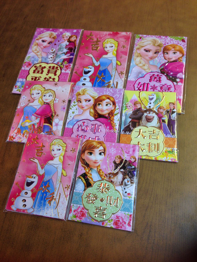 随着去年迪斯尼推出的动画电影《冰雪奇缘》大受欢迎后,商家也在今年从中国订购大量印有电影里各种角色的红包封,不同的排版设计多达10种,获得公众喜爱,是目前市场最畅销的红包封!