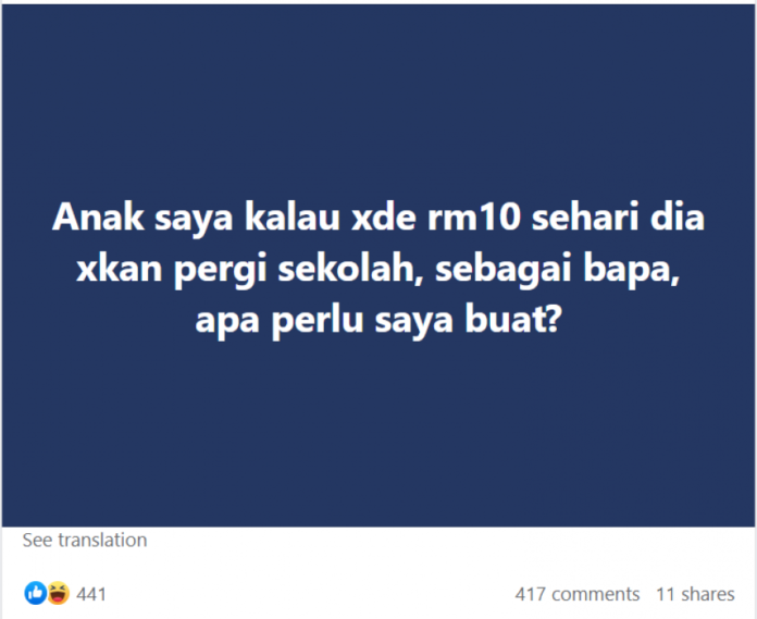 根据该名父亲的贴文,他表示,每日都必须给孩子10令吉零用钱,否则孩子会选择赌气不上学,这让他非常苦恼。