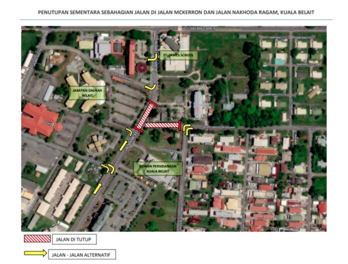 (汶莱斯市22日讯)公共工程局今日表示,马来奕Mckerron路和Nakhoda Ragam路部分道路将在本月23日暂时关闭。