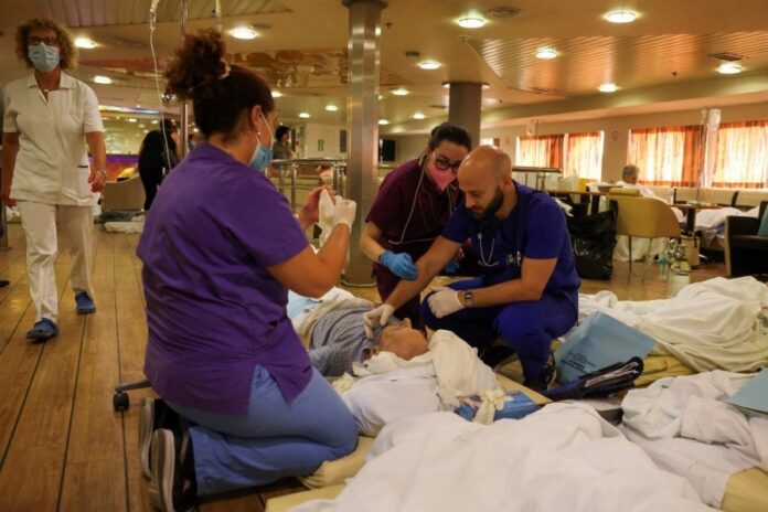 老年病人躺在渡轮自助餐厅地板上的床垫上,护理人员用担架照顾其他人,一名妇女抱著一名躺在沙发上的男子,他的手上吊著静脉滴注。