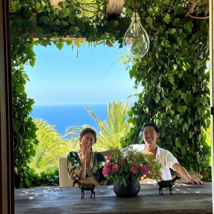 林志玲23日晒出了与AKIRA度假的合照。虽然她用手遮住了半张脸,但甜蜜的笑容依然展现出来。而坐在一旁的AKIRA也面露笑容,两人不仅容貌出众,还在美丽的背景下展现出浓厚的幸福氛围。