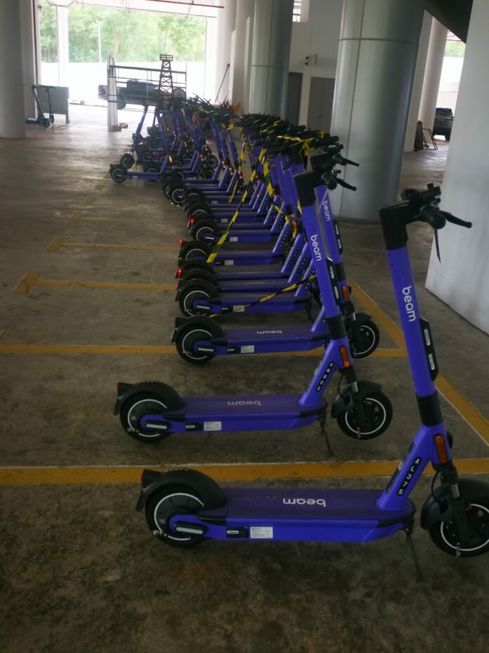 (美里24日讯)美里滨海城区市政局油桶大厦停车场底楼,目前停放了数十台电动滑板车(e-scooter),民众一旦成功下载BEAM手机应用程序后,便可以启动它,收费是绑定信用卡付费,每分钟60仙。