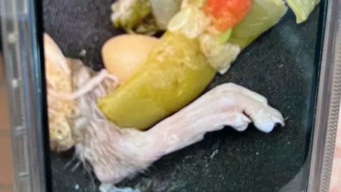 豪伊试图把食物吞下肚时却总是吞不下去,因此把异物取出查看,结果竟然看到一根带毛与爪子的老鼠腿,吓得他立刻把嘴里的东西都吐出来。当他向餐厅人员反映时,员工还笑说:“我们的杂菜汤通常里面是没有肉的。”让他气得报警。