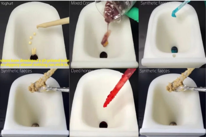 据每日邮报报导,中国华中科技大学的科学家利用3D列印,开发出一款“耐磨超滑冲水马桶(abrasion-resistant super-slippery flush toilet, ARSFT)”,这种马桶的材质十分光滑,研发团队用优格、粥、蜂蜜、泥水、牛奶、人工粪便等物质实验,皆能够迅速滑落且不留任何痕迹。