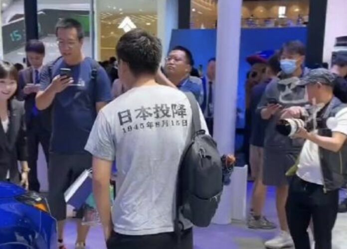 根据中国媒体的报道,汽车博主「名车工匠」在抖音平台上拥有超过63万名粉丝,他于25日在2023年成都国际车展上穿着印有「日本投降 1945.8.15」字样的T恤出席。