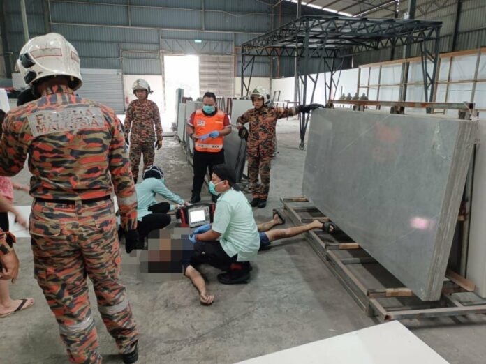 (巴生31日讯)华裔厂工在介绍产品时,仓库架上大板砖突然倾倒,当场在顾客面前被砸死!