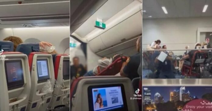 有乘客拍下了降落后的场景,显示伤者被抬出机舱,还有人在用冰袋冰敷头部。在机场,多人坐在轮椅上,戴着颈圈固定脖子。
