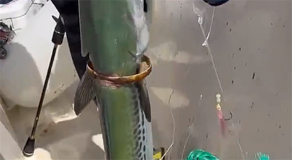 根据《快科技》的报道,这名钓鱼爱好者在钓鱼时拍摄了一段视频,展示了这一不寻常的场景。一条身上呈青色斑点的鲅鱼被成功钓上来,而鱼的身体下半部分卡着一个黄色的手镯,看上去已经卡住很长时间了。鱼身上出现了明显的勒痕,甚至有些部分的镯子已经嵌入到鱼的肉里,这让鲅鱼的情况看起来相当可怜。