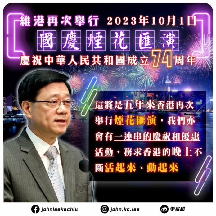 (香港5日讯)香港特首李家超周二早上出席行政会议前见记者时宣布,10月1日再次举办国庆烟花汇演,是5年以来香港再次烟花汇演,也有一连串庆祝及优惠活动,务求令香港的晚上活起来、动起来。