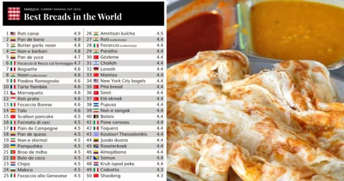 《8视界新闻网》报导,国际旅游美食网站“美味地图”(TasteAtlas)近日发布由公众评选出的“世界100种最好吃的面包”排行榜,马来西亚的印度煎饼以4.9的高分位居冠军宝座,新加坡的印度煎饼则以4.6分排名第12名。