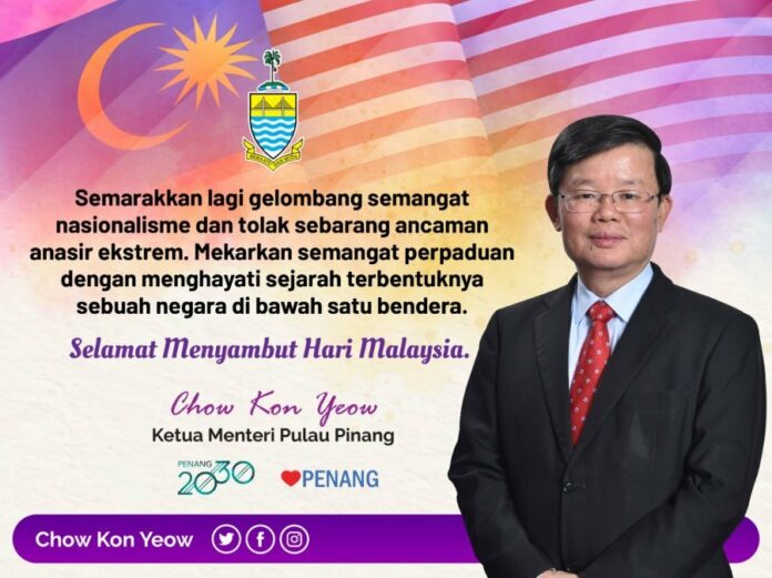 他说,今天,庆祝马来西亚日,为了马来西亚,为了槟城,一起创造一个积极、包容且以马来西亚宪法和国家原则为支持的未来,同时也要感悟一个在同一面旗帜下诞生的独立国家的历史。