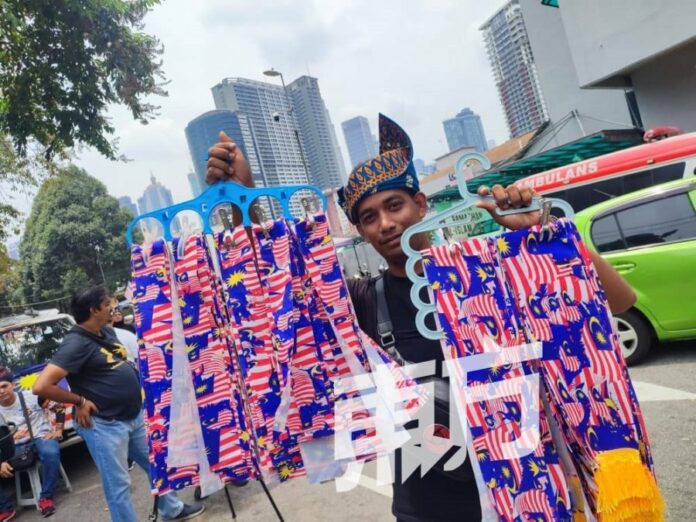 另一方面,也有几名商家在清真寺外摆档售卖印有国旗的围巾,以及小旗帜,吸引不少民众停下购买。